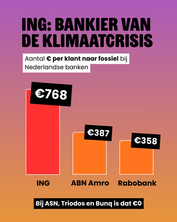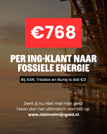 Uit ons nieuwe onderzoek blijkt: ING steekt €768 per klant in de fossiele industrie - meer dan welke andere Nederlandse bank dan ook.