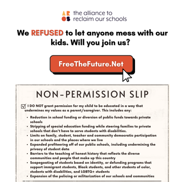 We’re organizing, refusing, and defending public education together. Join us today because our kids’ futures — and our democracy — are worth fighting for. #FreeTheFuture