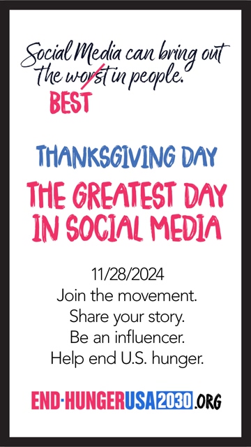 Thank you for joining us as an End Hunger USA 2030 Influencer and helping to make Thanksgiving “The Greatest Day on Social Media”! We're so grateful for your support.