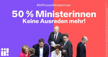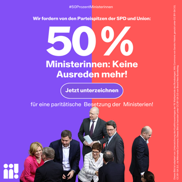 Der Koalitionsvertrag steht - verhandelt haben ihn vor allem Männer. Das darf kein Vorgeschmack für die Besetzung der Ministerposten sein! In diesen Tagen entscheidet sich, wer die Ministerien besetzt. Noch können wir Druck machen. Ich habe die Petition “50% Ministerinnen” unterschrieben. Bist Du auch dabei?