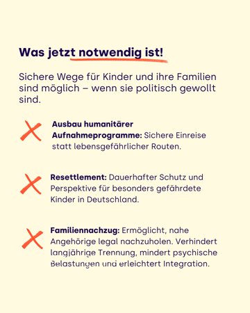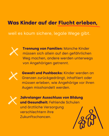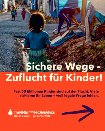 Weltweit sind fast 50 Millionen Kinder auf der Flucht. Am 20. November, dem Internationalen Tag der Kinderrechte, gehen wir auf die Straße: für sichere Fluchtwege, verlässlichen Schutz und gesellschaftliche Teilhabe für geflüchtete Kinder und Jugendliche. Terre des Hommes setzt sich dafür ein – weil jedes Kind zählt, egal woher es kommt. Mehr Infos in unserer Broschüre – jetzt herunterladen!