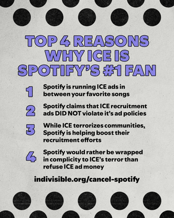 Social media feeds are full of people sharing their Spotify Wrapped, but Spotify is full of ICE recruitment ads. Cancel your subscription until Spotify stops helping ICE terrorize our communities.