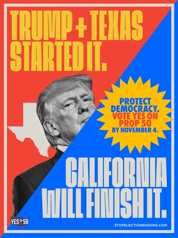 Donald Trump and red states are making an unprecedented power grab to steal congressional seats and rig the 2026 election before voting even begins. They want to steal enough seats to control Congress regardless of how the people vote. If Californians don’t act now, Donald Trump will seize total power for two more years. Use the below social media posts and sample video scripts to spread the word, and tag @YesOnCA50!